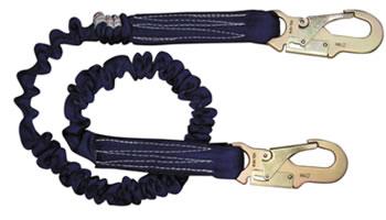 Elasticated 4-1/2’ to 6’ Shock Absorbing lanyard features single-leg construction and utilizes 1-5/8” tubular polyester webbing for resistance to UV light and abrasion. An internal band of high-modulus elastic allows the lanyard to expand and contract to avoid tripping hazards. Also features forged double-locking Offset snap hooks at the attachment and anchorage ends.