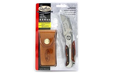 Item 12818: Premium Lockback Utility Knife Wood trimmed aluminum handle Quick change blade mechanism One hand opening operation Secure lockback mechanism Leather holster included