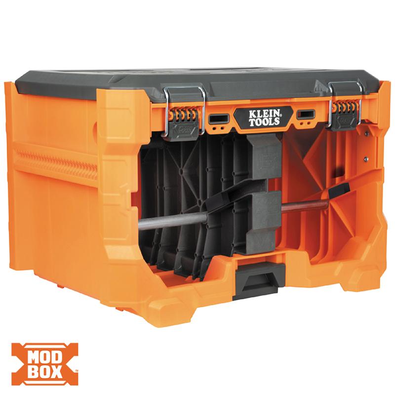 MODbox™ Wire Spool Dispenser streamlines wire management on the jobsite. It holds up to four 500-Foot spools of 10AWG wire inside and additional reels outside via a through-hole for conduit. Front guides and wire captures prevent unraveling. The lid with kickstand stays open for ceiling pulls. Built from impact-resistant polymers, supports up to 120 pounds, and has side rails for attachments. Easily connects with other MODbox™ components for a custom mobile workstation.