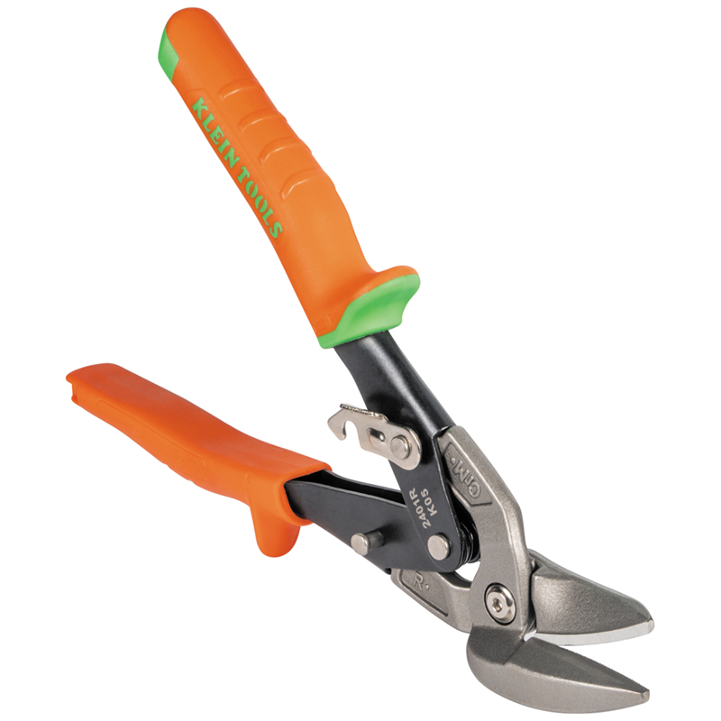 Cut and trim sheet metal in comfort with the Klein Tools right cutting Offset Snips. Snip blades are made of forged, heat-treated steel for strength and durability. Offset blades make it easier to cut in tight curves and keep the user's hand away from the metal. The contoured plastic handles with thumb guards are color-coded by cutting pattern.
