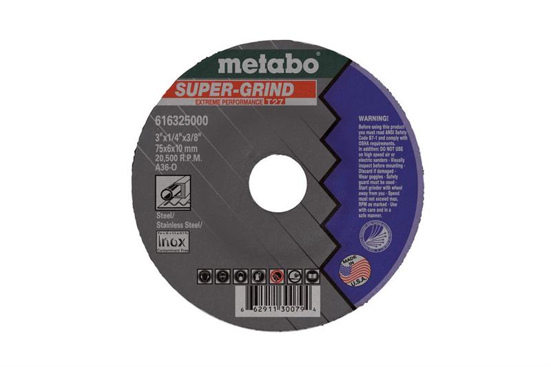 The Metabo Super Grinding Wheel is designed for heavy-duty grinding applications, offering efficient stock removal and long wheel life. With a 5-inch diameter, 1/4-inch thickness, and 7/8-inch bore, it ensures smooth grinding performance on stainless steel and other hardened metals.