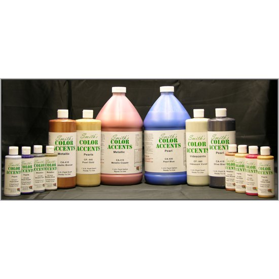 Smith's Color Accents are a waterborne extra strength coatings developed to achieve a lustrous appearance for the decorative concrete industry.Incorporating the use of metallic, iridescent, pearl, sparkle and bi-directional pigments, Smith's Color Accents is an excellent tool when creating unique works.Thanks to its superior adhesion, Accents can be applied to a variety of surfaces including, but not limited to, interior and exterior concrete, brick, plaster, stucco and terra cotta.The coatings are water submersible, alkali, weather and ultra violet light resistant after a minimal drying time of 48 hours.