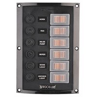 Ideal where panel front is subject to light spray and water. Note: Not designed for total immersion. Mounting gasket included. Panel rating: 12 volts, 37 amps total. Individual circuit: 10 amps maximum. Meets CE specifications. To customize panel to your specific setup, an assortment of preprinted labels and fuses are included.