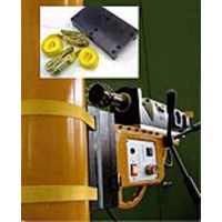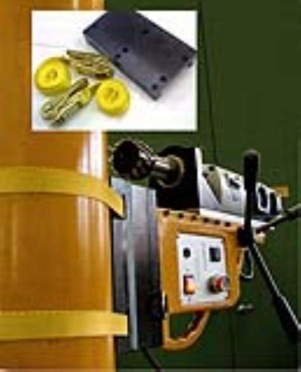 Pipe Clamp Attachment : With the pipe clamp attachment the magnetic drill can be mounted on round objects such as pipes, columns, etc. The pipe does not need to be magnetic since the attachment is held on by tensioning the two ratchet straps provided. The magnetic drill is positioned over the top plate of the attachment then the electromagnet is applied.Mag Base ExtensionThe Mag Base Extension accessory is available for every model of Powerbor machine. This accessory is a retro-fit, it simply clamps on over the existing magnet. The purpose of this accessory is to extend the magnet base pivot point rearward, this in turn improves the magnets breakaway load. This is particularly useful if drilling with large twist drills, which tend to generate a high drill point load.The accessory is available in three sizes:
