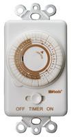 The In-Wall Mechanical Timer with Daily Settings turns indoor lighting on and off at set times. This timer is ideal for common areas in commercial and residential settings such as overhead lighting, ceiling fans, porch lighting, watering equipment or other medium-duty applications. There are up to 24 on/off settings per day for flexible programming, and a manual override switch which temporarily suspends switch operation without affecting the set schedule. This 24-hour in-wall timer conveniently replaces a standard wall switch and fits a single or multi-gang electrical box.