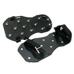 1'' plated steel spikes are pre-installed and recessed into a flexible black plastic sole
