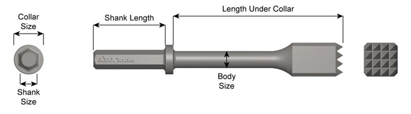 8 in (203.2 mm) Under Collar Length; 1 x 4-1/4 in (25.4 x 108 mm) Shank Size; 2 in (50.8 mm) Square; Bushing Tool Chisel