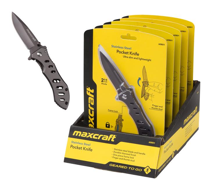 • One-piece frame lock design includes spring clip to secure knife to pocket or belt