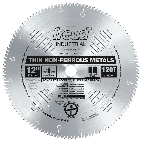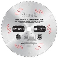This blade produces a smooth, burr-free finish when cutting thin aluminum, brass and other non-ferrous metal extrusions. A high tooth count with a 5° hook angle allows the teeth to slice efficiently through the material without binding. The requirements on the cutting edge greatly differ with nonferrous metals than with cutting wood. With this in mind, Freud formulated a special carbide with high impact strength for this blade. Freud recommends use of a liquid lubricant when cutting non-ferrous materials. This can be accomplished with a spray of WD-40 or other similar type of lubricant every 4 or 5 cuts. Wax sticks are not recommended.