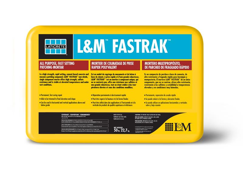 L&M™ FASTRAK™ is a high strength, cement-based concrete and masonry patching compound. This non-shrink, single component mortar offers high strength, sulfate resistance and is stable at elevated temperatures and under wet conditions. After initial set, L&M FASTRAK may be shaved or shaped to conform to surrounding surface contour.
