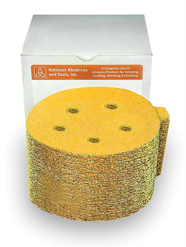 National Abrasives, 5" x No Hole x 220 Grit Aluminum Oxide Gold Sanding Discs with Tabs, PSA, Pressure Sensitive Adhesive, "C" Weight Resin Bond Paper, Stearated, No Hole, Link Roll, 100 Discs per Roll