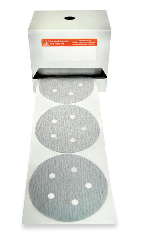National Abrasives, 5" x 8 Hole x 220 Grit Silicon Carbide White Sanding Discs with Tabs, PSA, Pressure Sensitive Adhesive, "B" Weight Resin Bond Paper, Stearated, 8 Hole, Link Roll, 100 Discs per Roll