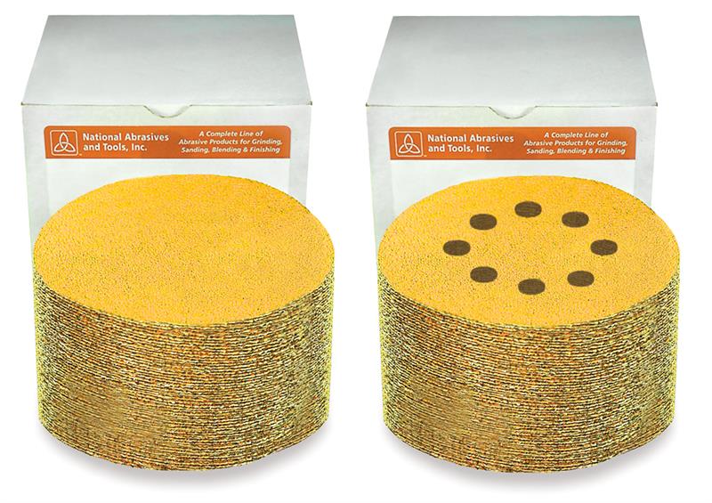 National Abrasives, 5" x No Hole x 180 Grit Aluminum Oxide Gold Discs Hook & Loop, "C" Weight Resin Bond Paper, Stearated, No Hole, 100 Discs per Pack