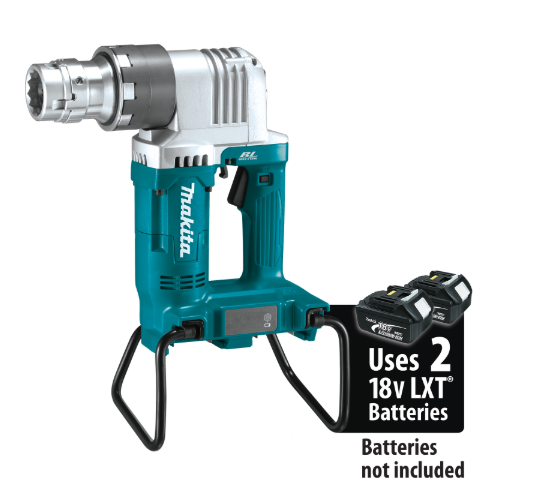 Two 18V LXT® Lithium-Ion batteries deliver the power and run time for corded demands without leaving the 18V LXT® platform (batteries not included) Powerful BL™ Brushless Motor delivers 593 ft. lbs. of torque to handle the most demanding applications Electric brake stops the rotation of the socket allowing the tool to be repositioned faster for maximum productivity Bolt tip ejecting lever located by power switch for easy tip disposal