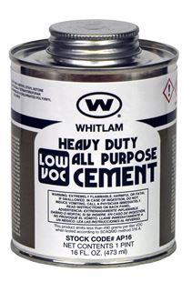 Use through 6" (15.24 cm) diameter Schedule 40 and Schedule 80 ABS, PVC and CPVC pipe. Whitlam All Purpose Clear Heavy Duty Cement is an extra strong medium bodied plastic weld cement of smooth consistency, formulated to work with ABS, PVC and CPVC solvent weld plastic pipe and fittings. It also will solvent weld ABS to PVC, PVC to CPVC or CPVC to ABS, provided tolerances of pipe and fittings match. Should be used in conjunction with Whitlam Clear Cleaner or Whitlam Purple Primer.