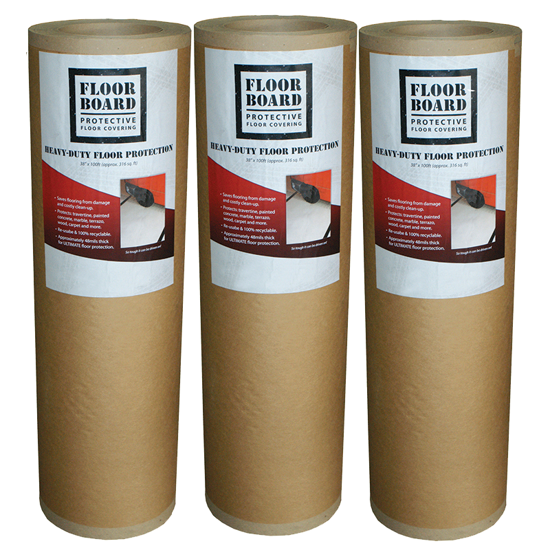 FloorBoard™ is a heavy-duty, non-adhesive, re-usable covering for the protection of flooring during construction or the remodeling process. It rolls out quickly and easily to provide protection while also allowing new floors to cure and is safe to use on concrete, tile, wood, stone, linoleum, and vinyl. Special ingredients make this product resistant to spills, overspray and most liquids for an extended period of time. FloorBoard™ is made of 100% recycled (95% post-consumer) materials, making it environmentally friendly.