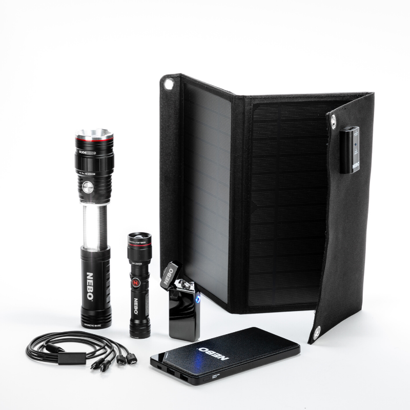 The SLYDE KING Emergency Prep Kit has it all: a 10 watt solar panel, 10,000mAh power bank, 500 lumen 2-in-1 flashlight and work light, a 450 lumen compact flashlight, rechargeable plasma lighter, USB charging cables, and a carrying case. No matter what the emergency, you'll be prepared with this great kit.