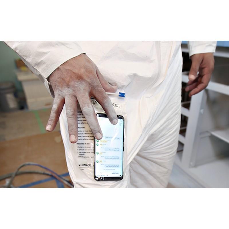 The Trimaco Insta-Pocket is a clear, plastic, self- adhesive plastic pocket that sticks to the exterior of coveralls. The watertight zipper protects the phone and keeps it clean from dirty hands and paint splatters. Includes 10 pockets and measures 5.75" x 8.75"