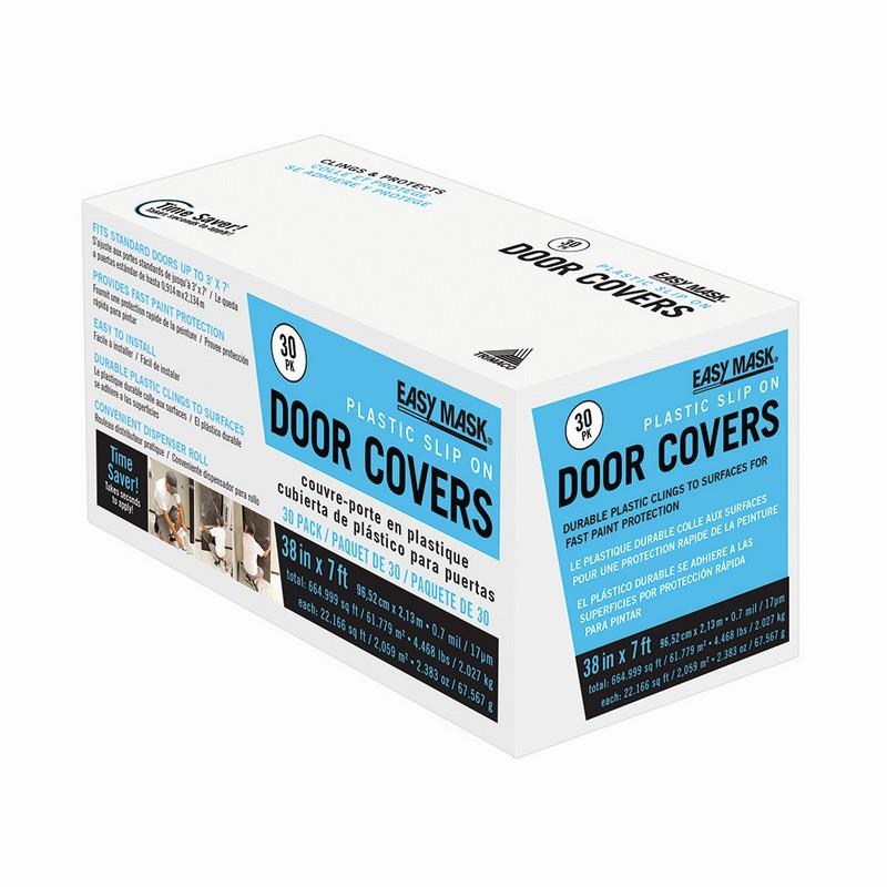 Trimaco Easy Mask® Plastic Slip on Door Covers provide quick, easy and dependable protector for standard sized doors. The duable plastic covres are packaged in a convenient dispenser box. To use, simply pull a door cover from the box, tear on the perforated edges, and slide over top edge of door.
