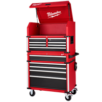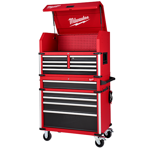 Our 36" High Capacity Steel Storage Combo is the best-equipped tool storage solution in its class. The tool storage cabinet and chest combo provides you with a reinforced angle iron frame, 1,800 lbs. weight capacity, 18-gauge steel construction, and 5" industrial-grade casters for superior durability. Our rolling tool storage cabinet has 12 drawers, giving you over 27,326 cu. in. of storage space with 100 lbs. rated, soft-close drawer slides for smooth opening and closing. This mobile toolbox offers you a variety of innovative features like our MILWAUKEE® built-in power center with 6 outlets and 2 USB chargers and power tool organizer to maximize your productivity.