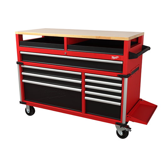 Our 52” High Capacity Mobile Workbench is the most durable and best-equipped tool storage solution in its class. The rolling workbench features an 18Ga steel body, 5-inch industrial casters, and a reinforced angle iron frame. The mobile workbench with drawers has a raised reversible 1.2 in. thick wood surface for clamping on 3 sides. The workbench provides ample working space with a surface of 22 in. at a height of 41 in. for a better ergonomic standing position. The MILWAUKEE® 52" High Capacity Mobile Workbench has 11 drawers that hold up to 100 lbs. each. Our tool work bench includes a built-in power center with 6-outlets and USB ports to charge your battery packs and electronic devices. An included bolt-on steel side shelf, a removable power tool holder and an adjustable long tool holder offer maximum versatility and productivity. Tackle any job with our 52" High Capacity Mobile Workbench.