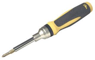 Includes: 1/4 in. and 3/16 in. slotted, #1 & #2 Phillips, 1/4 in., 5/16 in., 7/16 in. nutdrivers, ratcheting screwdriver end, ratcheting wire connector wrench