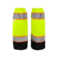 These leg gaiters are high-visibility yellow/green lightweight mesh polyester with a black solid bottom. They are 18.5 inches long and feature 3M™ reflective material with contrasting orange trim for enhanced visibility. The zipper has a button snap at th