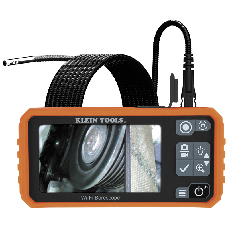 Pro Borescope with dual-lens camera for comprehensive viewing in hard-to-reach areas. Ideal for automotive, plumbing, mechanical, and behind-wall inspections. It comes with a 9.8-Foot (3 m) armored snake, hook, and mirror attachments, and a 5.5 mm waterproof (IP67) camera with adjustable LEDs. It features a 4.3-Inch Color LCD monitor (1920 x1080) resolution, 3 times zoom, and 180-Degree screen view rotation. Transfer photos and video via Klein Tools ET19 App (in the Play Store and App Store).
