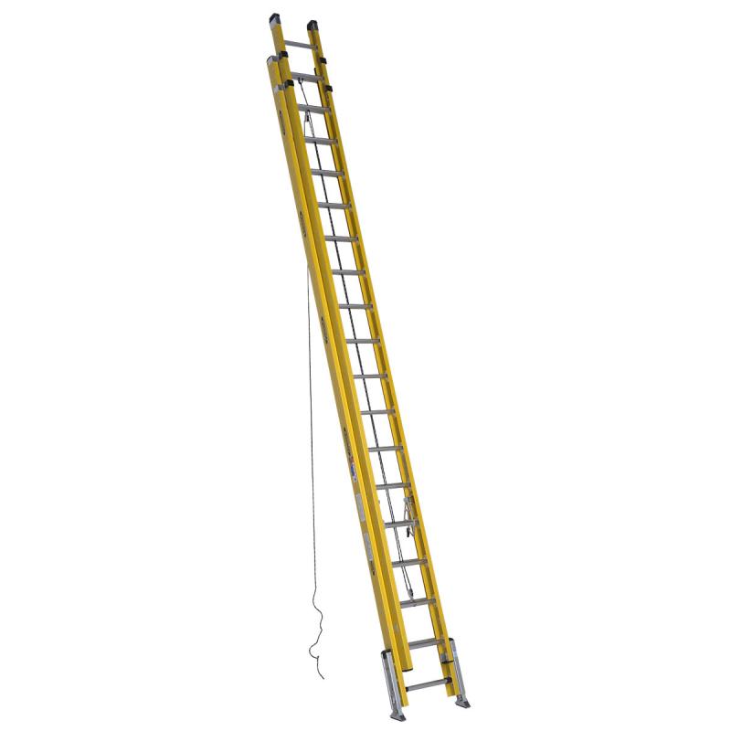 The D7100-2LV series extension ladders boast a duty rating of 375 pounds and have factory-installed LeveLok levelers to enable the ladders to adapt to uneven terrain. With simple foot action, each leveler can extend up to 10" in 3/16" increments. These ladders are ideal for utility or telecommunication industries. The external guides at the top of the base section secure the interlocking rails. The top of the fly section has pre-pierced holes for easy installation of accessories. The base and fly sections easily separate to use the base section as a single ladder. Fiberglass rails are non-conductive for working near electricity. (36' & 40' do not have interlocking rails.