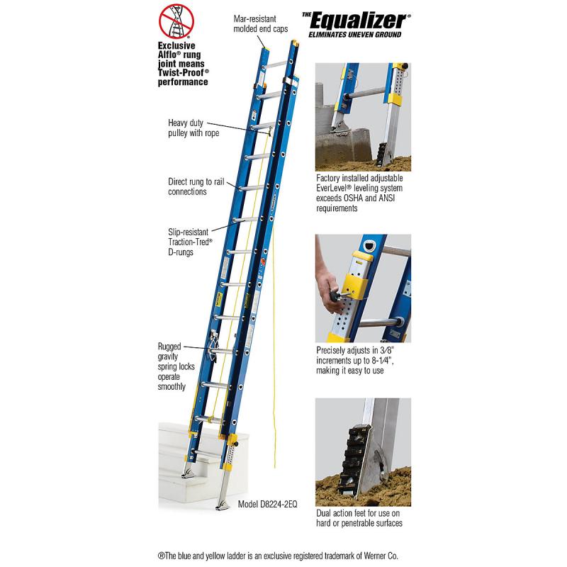 D8200-2EQ The Equalizer series eliminates uneven ground with the factory installed adjustable EverLevel leveling system. This system precisely adjusts in 3/8" increments up to 8 1/4", making it easy to use. The dual action feet on the ladder are for use on hard or penetrable surfaces and swivel easily. The Traction-Tred D-rungs are slip resistant. The ladder has a duty rating of 300 pounds making it durable, long lasting and able to meet the demands of the job. The exclusive ALFLO rung joint means a TWIST-PROOF performance every time, and the fiberglass rails are non-conductive.