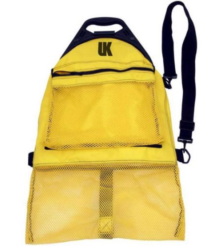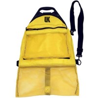 The UK Game Bag is the best bag ever for diving. Use it as a gear bag to haul mask, fins, snorkel, regulator etc. onto the dive boat or to the beach. In the water, the Game Bag folds in-half and snaps together for clipping on your weight belt or BC. A three point strap system allows the bag to be carried as a backpack or slung over one shoulder. The bottom of the bag is made from tough polyester mesh for quick drainage. The upper portion of the bag around the handle is made from polyester fabric so that lobsters, crabs and other spiney game can be shoved into the bag easily without hanging up. An exterior pocket is great for keeping small tools, stringer line, dive light, gloves or the like.