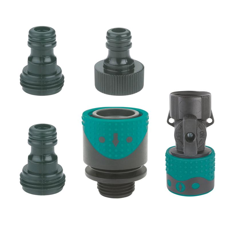 Includes 1 female hose end connector with water shut-off valve, 2 male hose end adapters, 1 female faucet connector and 1 male faucet adapter