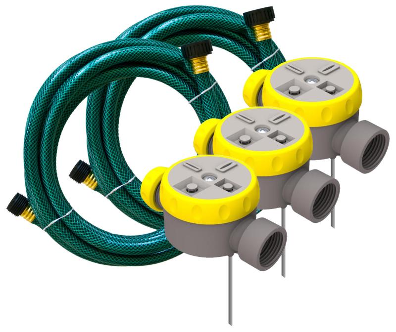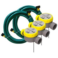 Includes two 15 Ft. sections of 1/2 In. reinforced garden hose with plastic couplings, 3 sprinkler heads with fold-out spikes