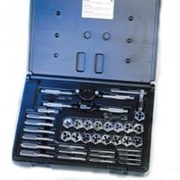 Champion 40 Piece Metric 302M Plug Taps and CS30M Hex Dies Set. 3x.5, 3x.6, 4x.7, 4x.75, 5x.8, 5x.9, 6x1.0, 7x1.0, 8x1.25, 9x1.0, 9x1.25, 10x1.25, 10x1.5, 11x1.5, 12x1.5, 12x1.75; 1/8-28BSP pipe tap, 1/8-28BSP pipe die. Accessories: die stocks, tap wrenches, metric screw pitch gauge and screwdriver in molded plastic case.
