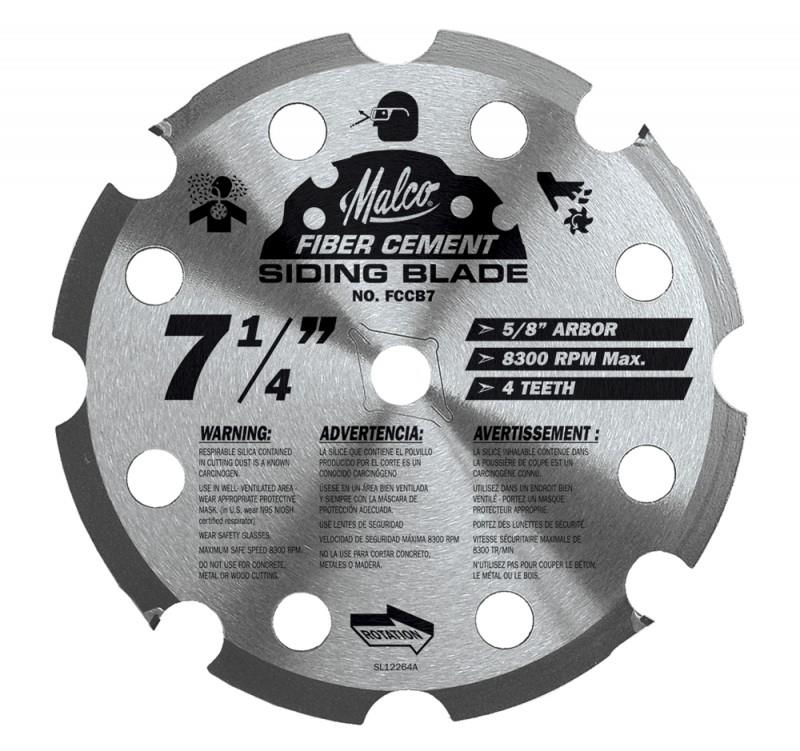 For repetitive cuts in fiber cement with power miters or portable circular saws, Malco now offers specialized Circular Saw Blades with PCD (PolyCrystalline Diamond) faced carbide tips for longer life. A lower number of teeth and deeper gullets produce cleaner, more precise cuts resulting in an accurately matched trim edge and tighter seams. Perfectly tensioned, hardened tool-steel blade assures a flat true run. Available in 7-1/4” (184 mm) 4-tooth, 10” (254 mm) 6-tooth and 12” (305 mm) 8-tooth configurations for use with the full range of circular saw equipment. WARNING • Fiber cement contains crystalline silica. Respirable silica contained in cutting dust is known to cause cancer.