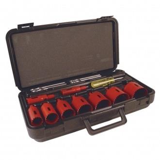 Maintenance Hole in One Kit. One each of the following sizes: 2-1/2, 2-1/4, 2, 1-3/4, 1-1/2, 1-3/8, 1-1/8, 7/8 and 3/4”. (63.5, 57.2, 50.8, 44.5, 38.1, 34.9, 28.6, 22.2, 19.1 mm) Plus (4) HSB drills, (1) HSX extension arbor shank and (1) stubby driver.