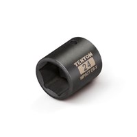 The TEKTON 1/2 in. Drive x 24 mm Shallow Impact Socket is engineered for use with impact drivers. It has a 6-point opening that snugly fits the hex shape of fastener heads, allowing it to apply maximum torque without slipping. To prevent round-off under stress, it grips the flat sides of fastener heads rather than the corners. Easy to read even in low light, the large, high-contrast size marking is permanently laser etched into the steel surface. The through-hole in the drive end locks onto the tang of impact wrenches or drivers so it won't fall off or stick on fastener heads. To protect against rust and corrosion, the black phosphate finish absorbs and holds oil, repelling moisture.
