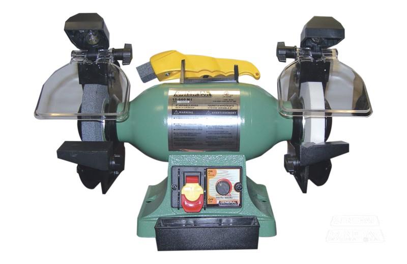 Two flexible work lights for clear view of grinding wheels and workpiece.