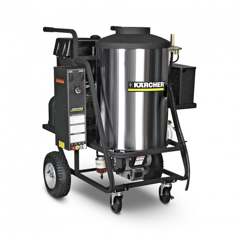 The unique design of the Kärcher hand truck features an all-metal frame, heavy-duty vertical heating coil with stainless steel wrap and pneumatic tires. Units come with belt-drive Kärcher crankcase pumps. ETL certified to UL and CSA safety standards.