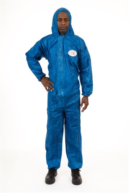 Disposable coveralls with fabric that has been tested for protection against blood, blood-borne pathogens and many other liquid hazards. Strong, fabric that has excellent abrasion resistance and resists tears. Helps to keep the wearer cool and avoid heat stress through enhanced moisture vapor transmission. Attached hood with elastic wrists & ankles for snug, secure fit. Zipper front with sealable storm flap provides an additional layer of protection. Blue color makes stains and splashes on fabric less conspicuous. Recommended applications include emergency response, category 3 black water, tank cleaning, crime scene remediation and animal research.