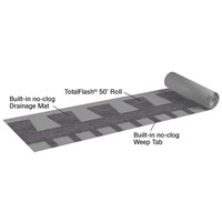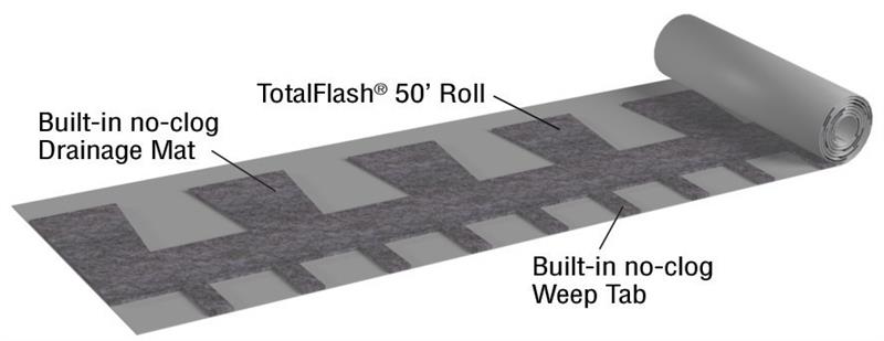 The patented TotalFlash Roll Cavity Wall Drainage Solution is a factory-assembled masonry cavity wall flashing system that provides better performance than standard through wall flashing. It combines a flashing membrane, mortar dropping collection drainage mat, and drainage mesh weep tabs into a single, easy-to-install 50' roll. It provides superior moisture protection, slashes labor costs, and can be custom configured for your job, usually at no additional charge.