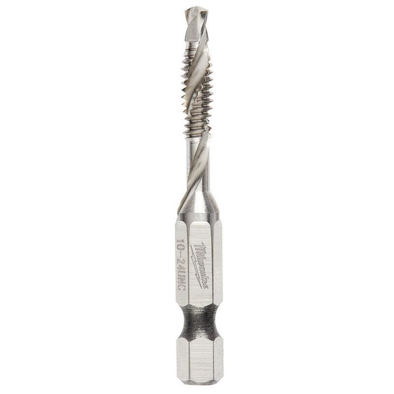 Milwaukee® SHOCKWAVE™ 10 - 24 UNC Impact Drill Tap drills and taps at the same time. The bits features 24 threads per inch and is intended for use in up to 1/4 in. metal. The laser etched size allows for easy size identification. The bit is designed for use in Impact Drivers & Drill Drivers.