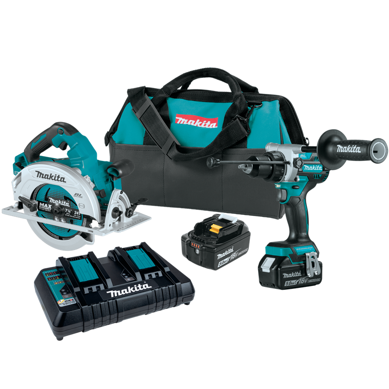 18V LXT® Brushless 2-Piece Combo Kit (model XT290PT) gives you two brushless solutions for drilling, driving and fastening. Each tool features an efficient Makita BL™ Brushless Motor that is electronically controlled for longer run time, increased power and speed, and longer tool life. The combo kit includes a 1/2" Hammer Driver-Drill with a full 1,250 in.lbs. of Max Torque for the most demanding applications in wood, metal and masonry. The kit also includes a 7-1/4" Circular Saw delivers 6,000 RPM and features a large 2-5/8” cutting capacity at 90°. The 18V LXT® Lithium-Ion 5.0Ah batteries have the fastest charge times in their category, and for increased convenience they include an on-board L.E.D. charge level indicator.