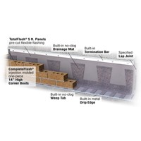 The patented TotalFlash Cavity Wall Drainage Solution is a complete, factory-assembled masonry cavity wall flashing system that cuts labor costs and provides better performance than standard through wall flashing. It combines a flashing membrane with a mortar dropping collection drainage mat, weep tabs, drip edge and termination bar into a single, easy-to-install panel. TotalFlash is suitable for use at all flashing locations, including base of wall, above exterior wall openings and bond beams, in parapet walls, and wherever flashing is desirable. And TotalFlash is more than just a product. Every TotalFlash job includes free services to help make purchasing and installation headache-free, including expert takeoffs, bid help and custom panel sizing for wall openings.